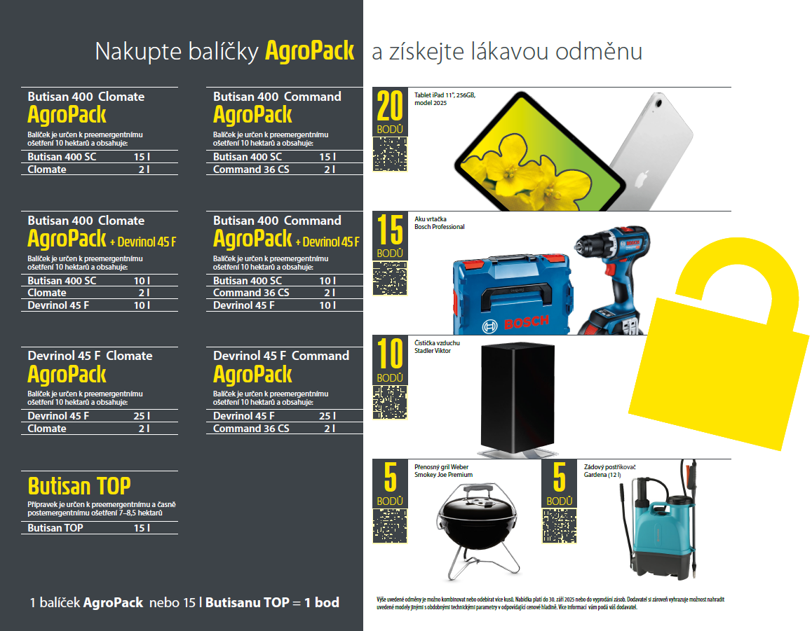 Společnost AGROFERT, a.s. přináší i v roce 2025 oblíbený bonusový program „AgroPack s odměnou“. Pokud si do 30. 9. 2025 zakoupíte alespoň 5 balíčků AgroPack nebo odpovídající množství (alespoň 75 litrů) přípravku Butisan TOP, čeká na vás atraktivní odměna.